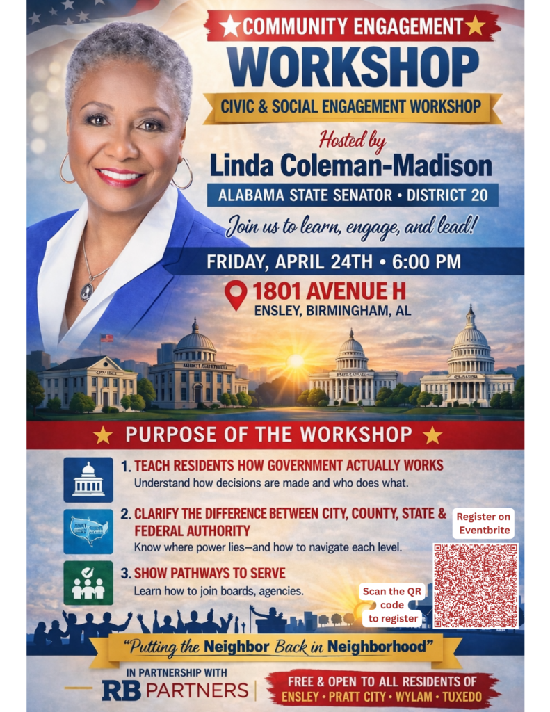 Join us for a Community Engagement Workshop hosted by Senator Linda Coleman-Madison, in conjunction with Renew Birmingham and RB Partners—an engaging and informative event designed to empower residents with a better understanding of how government works. Attendees will learn about the different levels of government, how decisions are made, and practical ways to get involved in shaping their community. Whether you’re new to civic participation or looking to deepen your involvement, this workshop offers valuable insights and opportunities to make your voice heard.